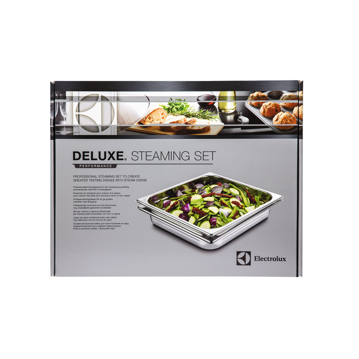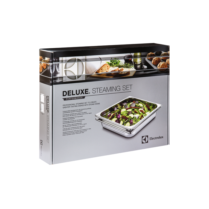 Electrolux Large Professional Dampsett for ovner med full damp. Rustfritt stål i høy kvalitet for dampmatlaging. Inneholder 1 perforert panne og 1 tett panne, H: 55m / B: 325 mm / d: 354 mm.