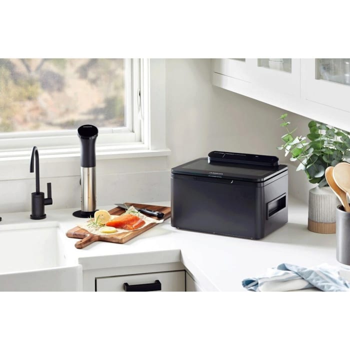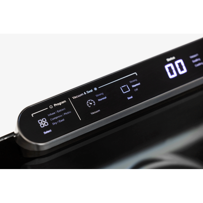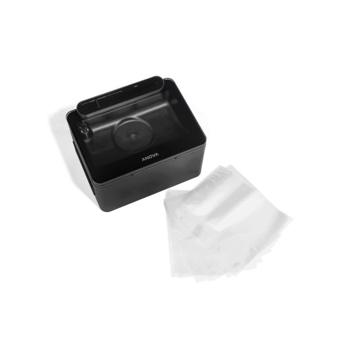 Anova Precision™ Chamber Vacuum Sealer er en fullt operativ kammerforsegler som er betydelig mindre i størrelse og gjort mer intuitiv å bruke enn de som vanligvis finnes i profesjonelle kjøkken. Forhåndsprogrammerte innstillinger lar deg forsegle som en proff, til og med væsker, eller benytte deg av trykket i kammeret for å lage ting kjapt som sylteagurker, infuserte alkoholer, smaksatte oljer og mye mer. Så enkelt og kun med et knappetrykk."
