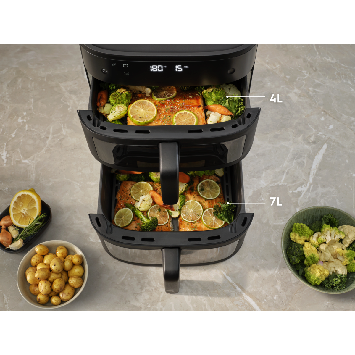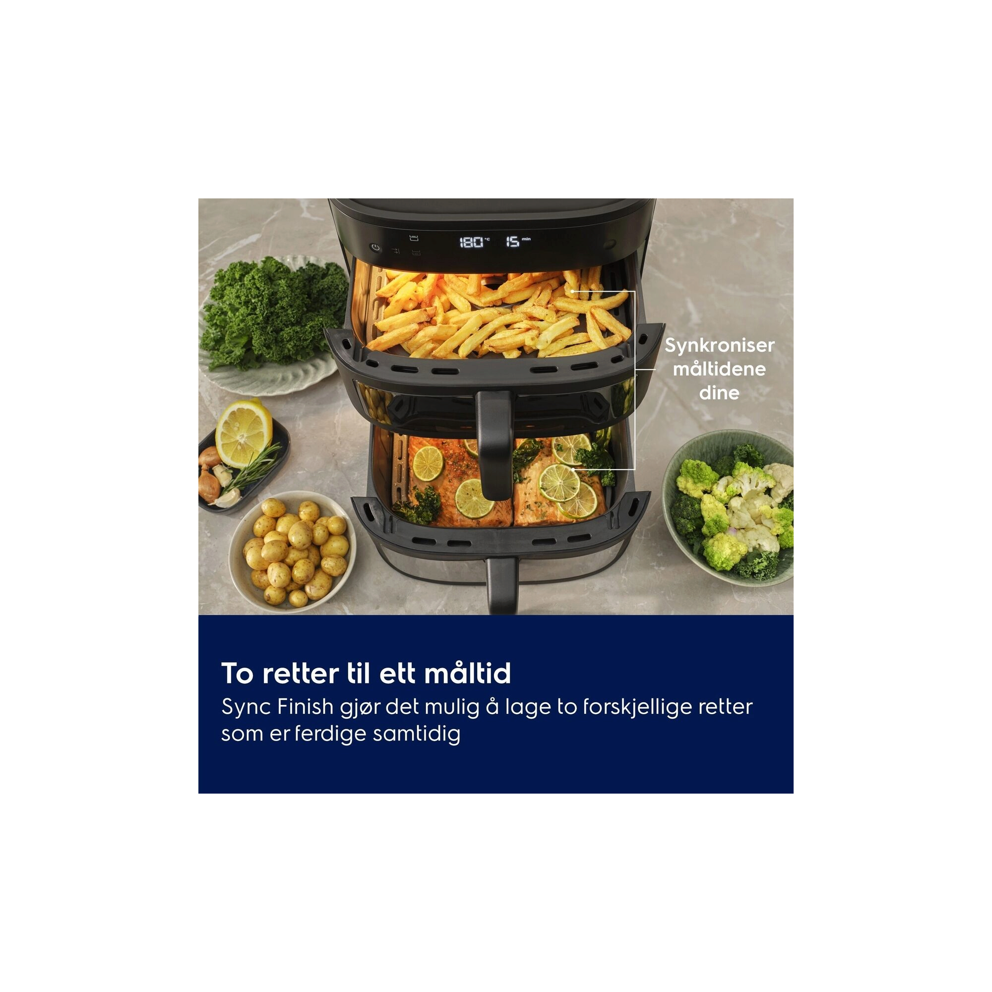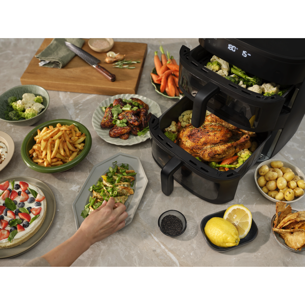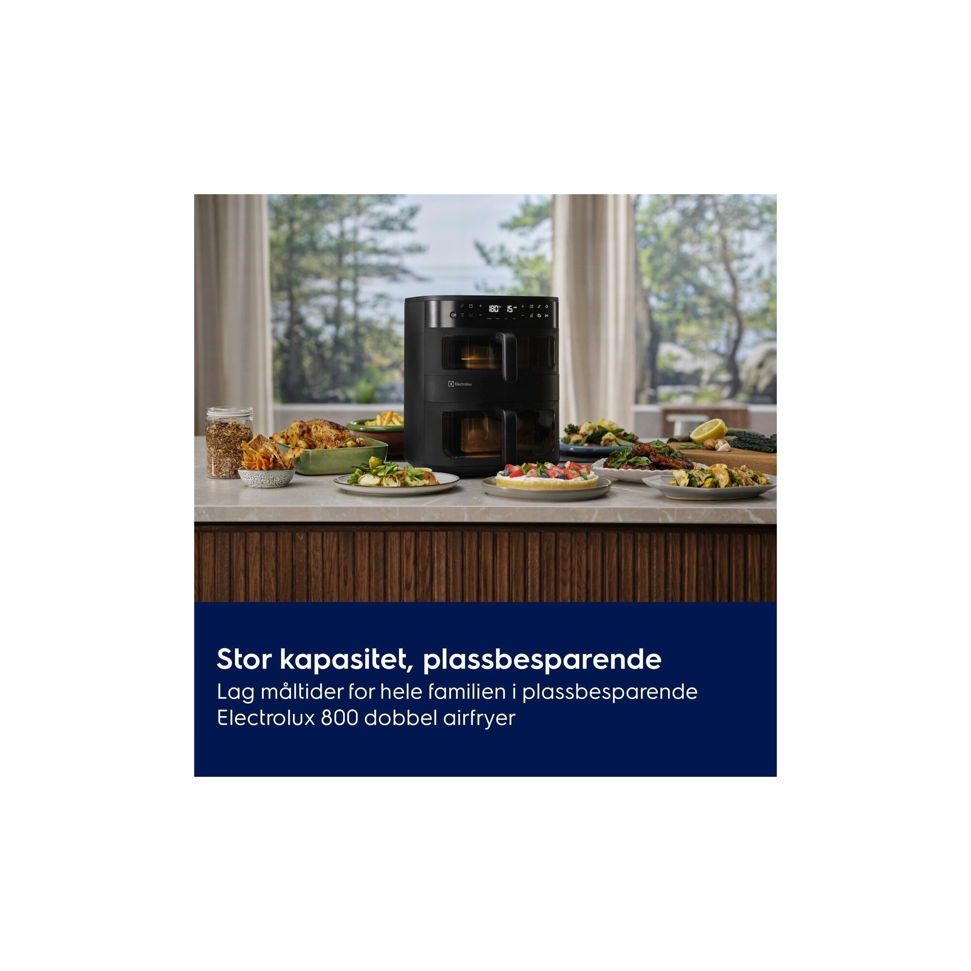 800 Air Fryer Dual, 4 + 7,6 L kurver, 2750 W, LED-display med berøringsskjerm, 4 forhåndsinnstilte funksjoner: Air Fry, Bake, Dehydrate og Roast. 4 forhåndsinnstilte oppskrifter: Kylling, Fisk, Biff, Grønnsaker. Temp: Air Fry 60–200 °C, Dehydrate 40–80 °C, tidsstyring opptil 99 minutter. Farge: Matt svart.