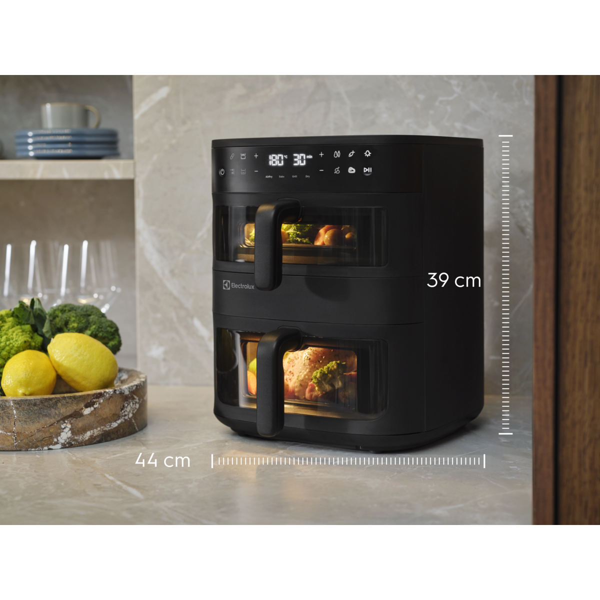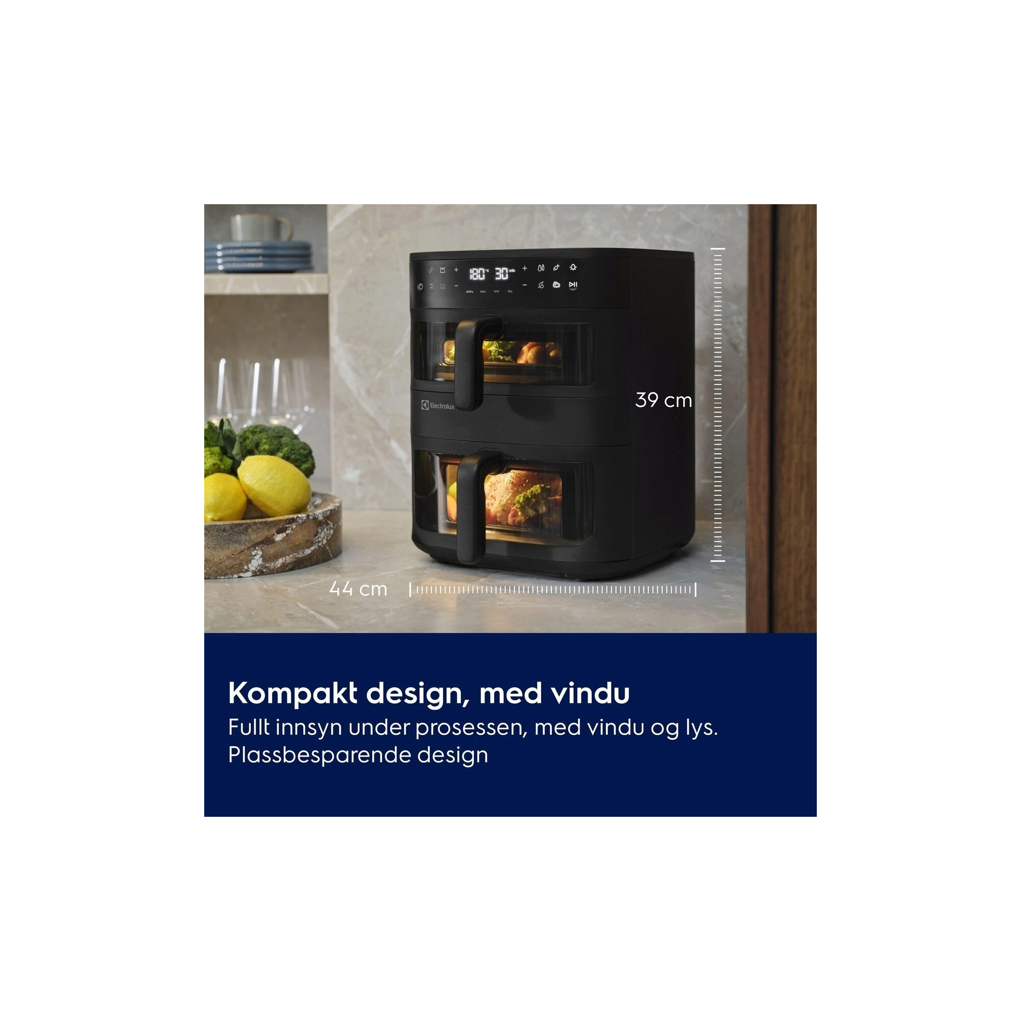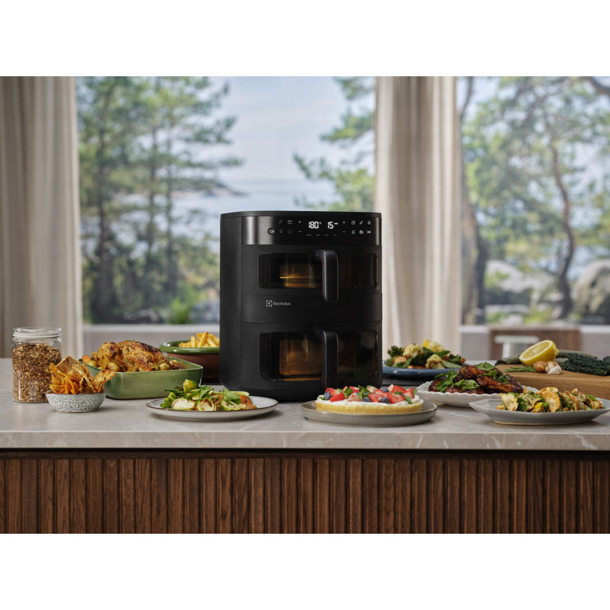 800 Air Fryer Dual, 4 + 7,6 L kurver, 2750 W, LED-display med berøringsskjerm, 4 forhåndsinnstilte funksjoner: Air Fry, Bake, Dehydrate og Roast. 4 forhåndsinnstilte oppskrifter: Kylling, Fisk, Biff, Grønnsaker. Temp: Air Fry 60–200 °C, Dehydrate 40–80 °C, tidsstyring opptil 99 minutter. Farge: Matt svart.