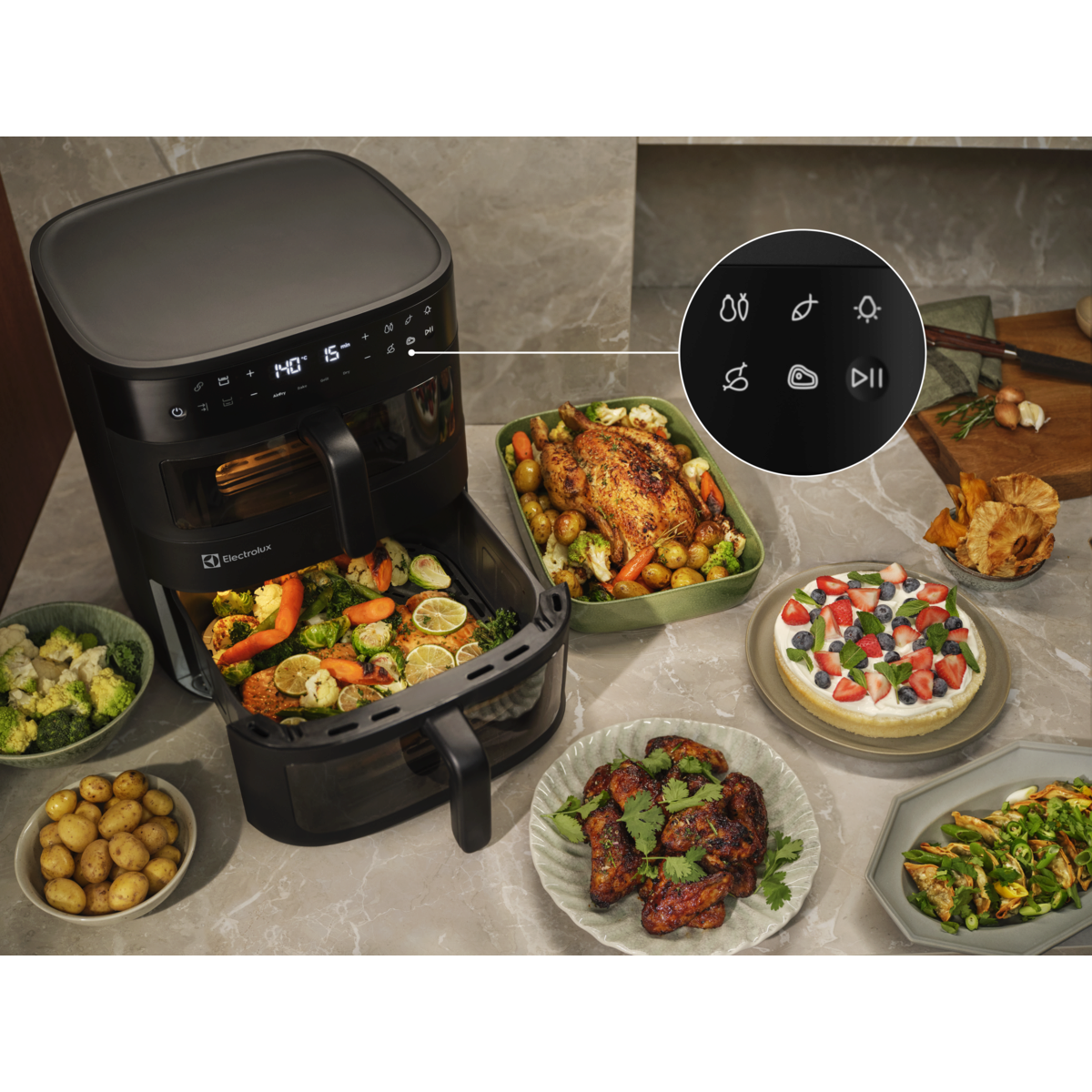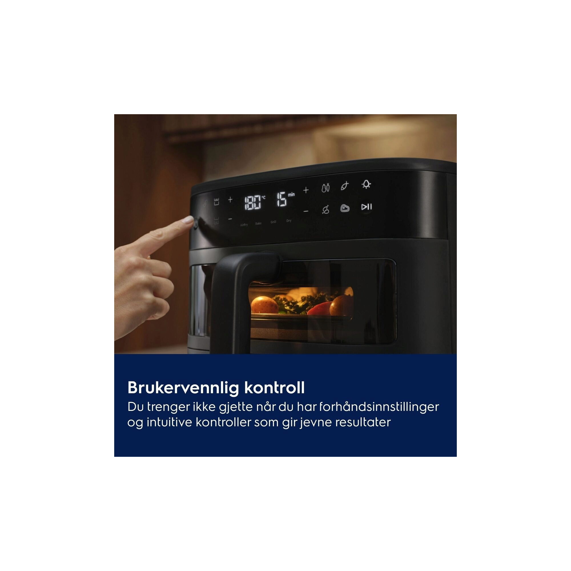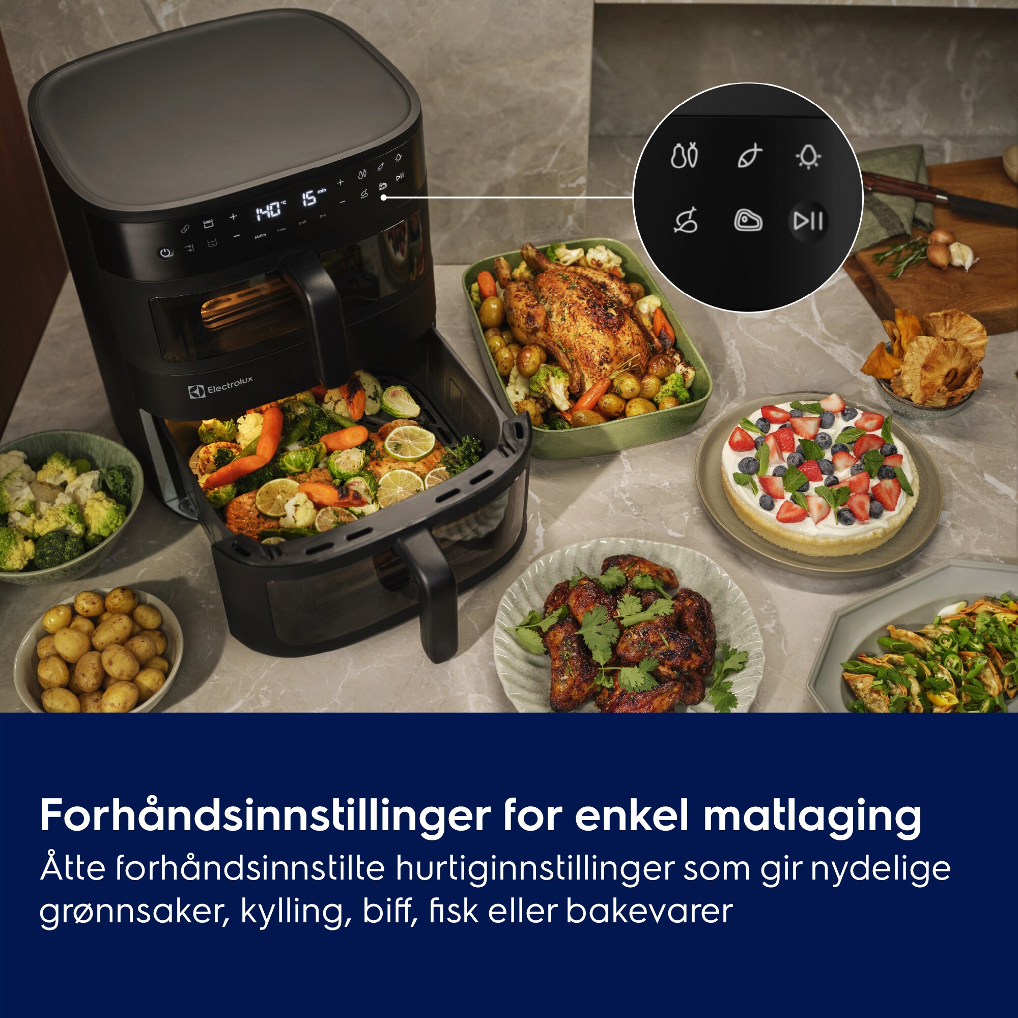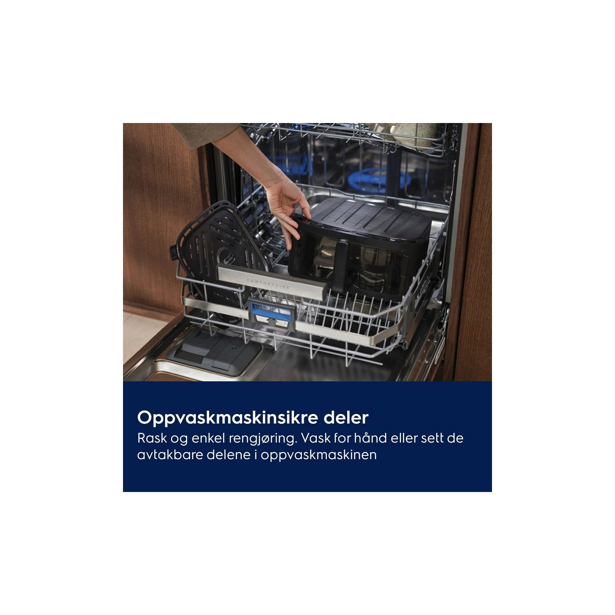 800 Air Fryer Dual, 4 + 7,6 L kurver, 2750 W, LED-display med berøringsskjerm, 4 forhåndsinnstilte funksjoner: Air Fry, Bake, Dehydrate og Roast. 4 forhåndsinnstilte oppskrifter: Kylling, Fisk, Biff, Grønnsaker. Temp: Air Fry 60–200 °C, Dehydrate 40–80 °C, tidsstyring opptil 99 minutter. Farge: Matt svart.