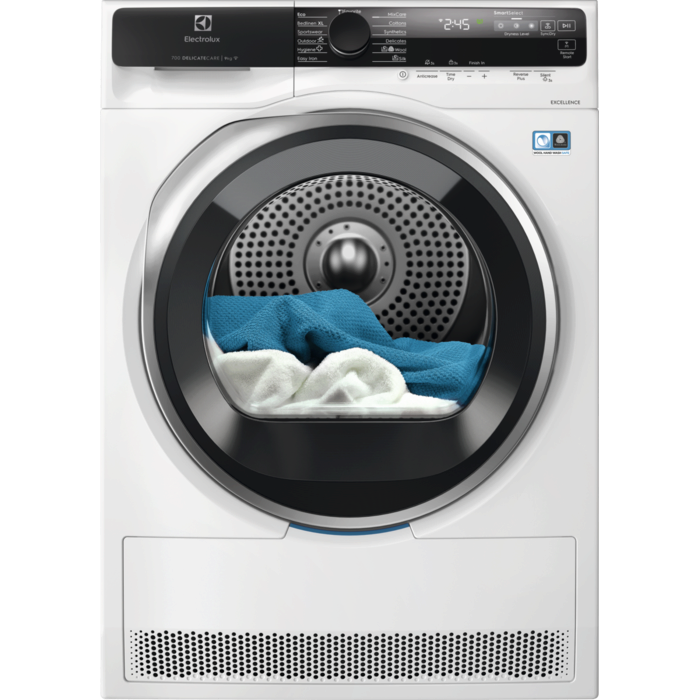 700 DelicateCare Varmepumpetrommel justerer temperaturen og bevegelsen på trommelen til spesifikke stoffer, og sikrer skreddersydd pleie. Silke bevarer formen, ulltøy blir trygt tørket uten krymping og vannmotstand på utendørsplagg gjenopprettes. Woolmark-sertifisert.