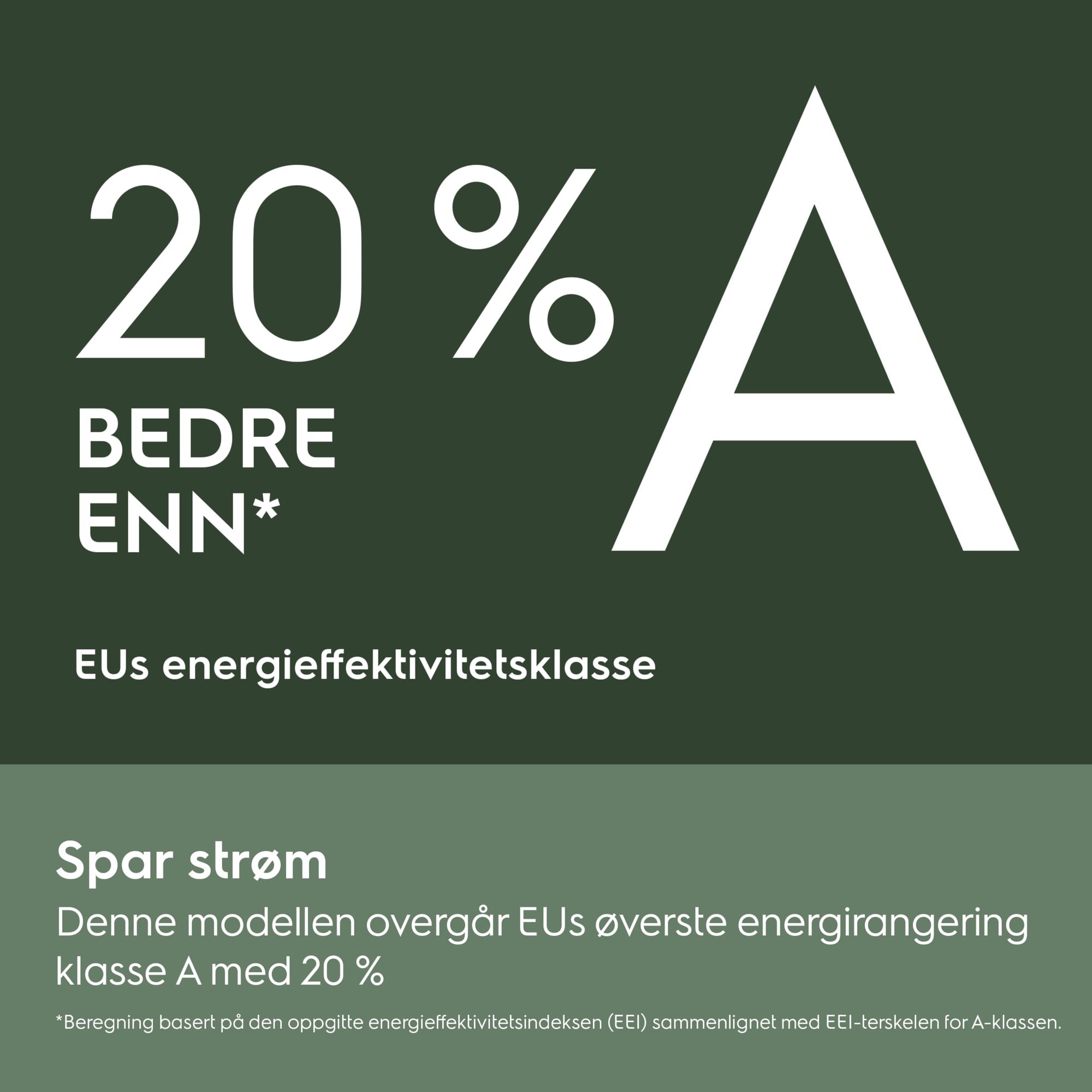 * Basert på en intern test som sammenligner forbruk av energi, tid og vann for SmartSelect Normal-innstilling Bomull 40° med SmartSelect Extra Light-innstilling Bomull 20° med en tøymengde på 4 kg bomull.