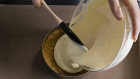 Hell fyllet ditt i kakebunnen, og stek i 15 minutter ved 180 °C. Deretter senkes temperaturen til 120 °C i ytterligere 25 minutter, eller inntil kaken har stivnet, men er litt fuktig i midten. Ta den ut av ovnen og legg den på en rist. Avkjøl helt til ostekaken har stivnet og er glatt som silke.