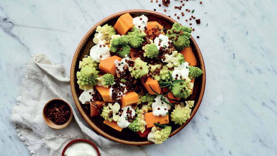 - Server de dampede grønnsakene med kremen og avslutt med en sprø linse-nøttcrumble.
