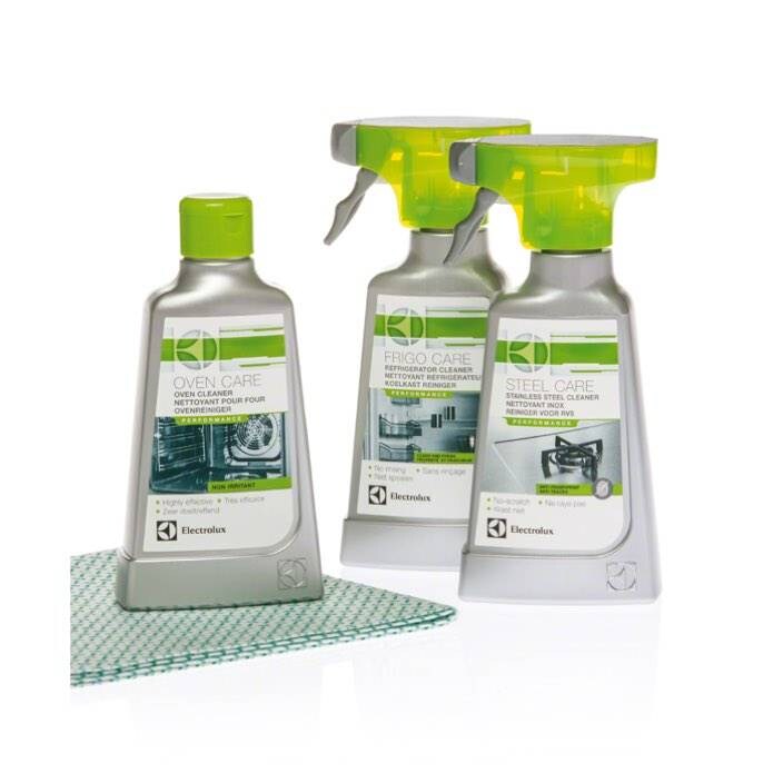 Kitchen Care settEt komplett care-sett for ditt kjøkken som inkluderer Steel Care for rengjøring av metallflater på utsiden, Oven Care for rengjøring av innsiden av ovnen og Frigo Care for nøytralisering av lukter.