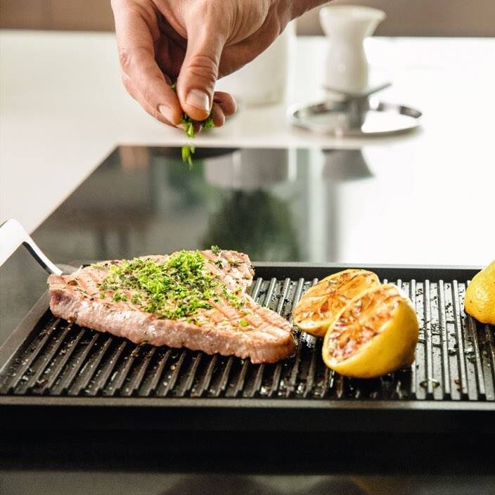 Grill-/stekepanneGrill-/stekepannen, med sine høye kanter, passer veldig bra når du ønsker grille fisk, kjøtt og fjærfe. Den kan også brukes til å samle fett når du griller på risten. Glem ikke å ta vare på fettet – det kan bli en delikat saus.