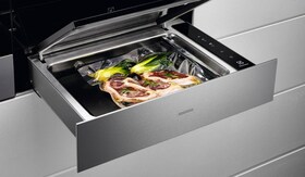 Bruk innstillingene SousVide på din Steam Pro Smart Ovn når du ønsker å lage mat med denne teknikken. Vannskuffen må være fylt med vann, samme som å lage mat med damp. SousVide innstillingen er for å tillage kjøtt, fisk, sjømat, grønnsaker og frukt på lav temperatur. Når maten er ferdig, behøver den vanligvis brynes raskt for å bli helt klar.