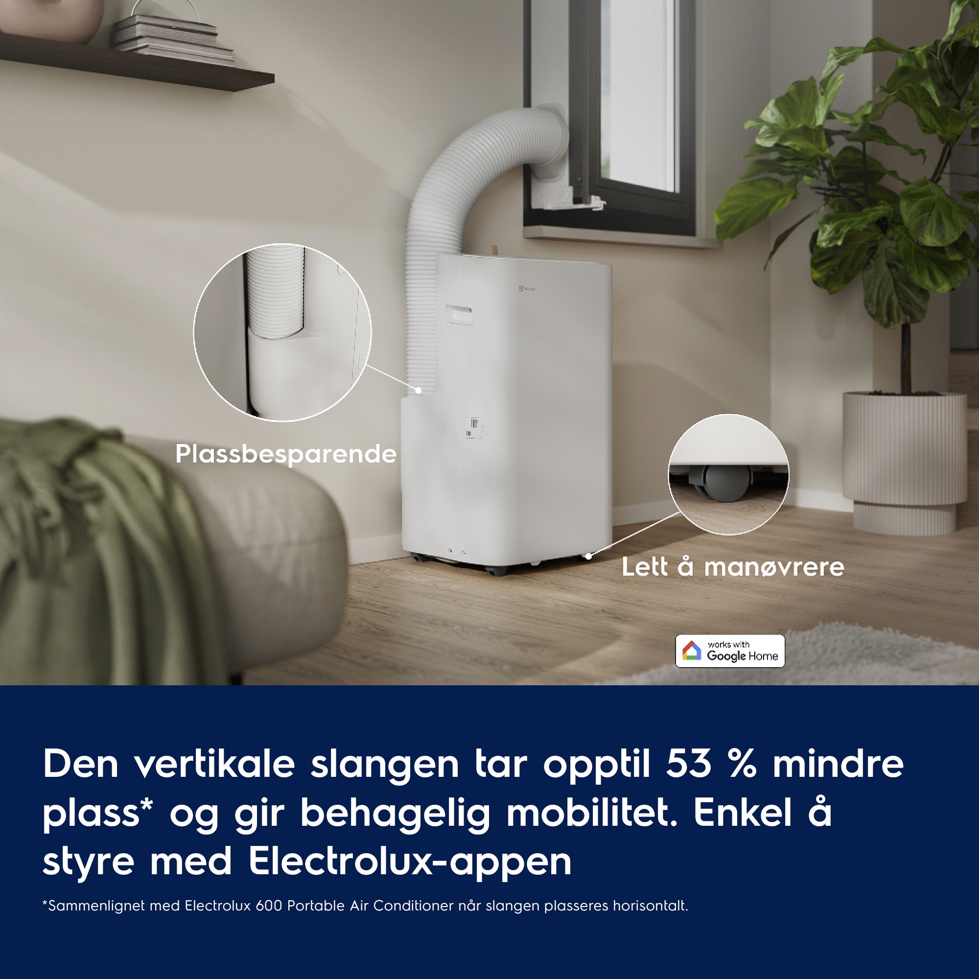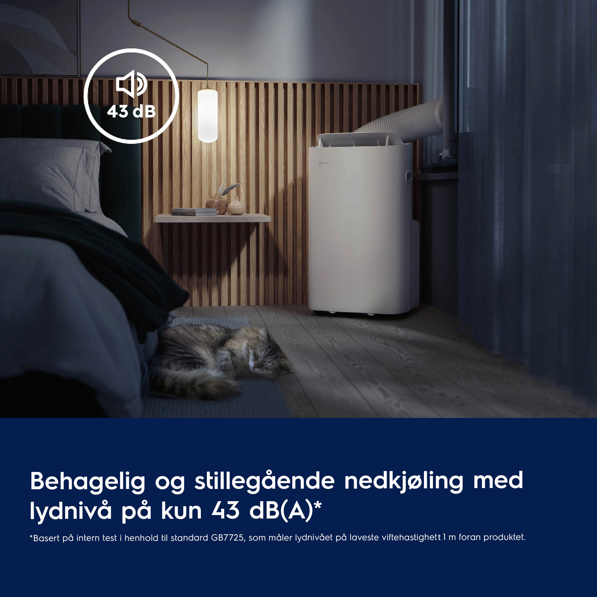 ¹Sammenlignet med Electrolux 600 bærbart klimaanlegg når slangen plasseres horisontalt ²Klimaanlegget er laget med 8 % resirkulerte materialer basert på produktets totale vekt, ekskludert emballasjen, bestående av resirkulert plast.