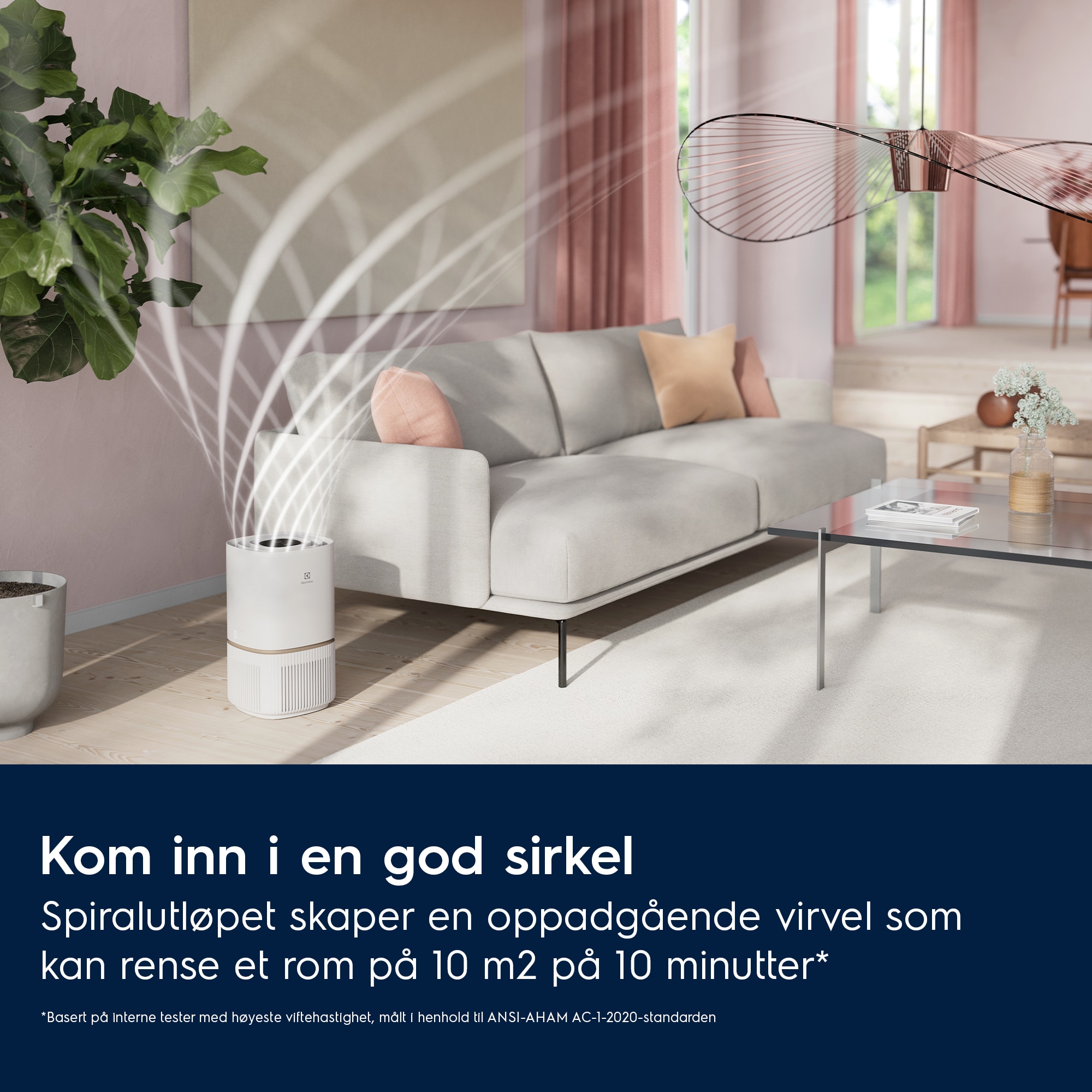 Overvåk luftkvaliteten hjemme uansett hvor du befinner deg med den kompakte og tilkoblede Pure 500 Mono luftrenseren. Firetrinns filtreringssystemet med spiralutgang sirkulerer renset luft jevnt rundt i rommet.