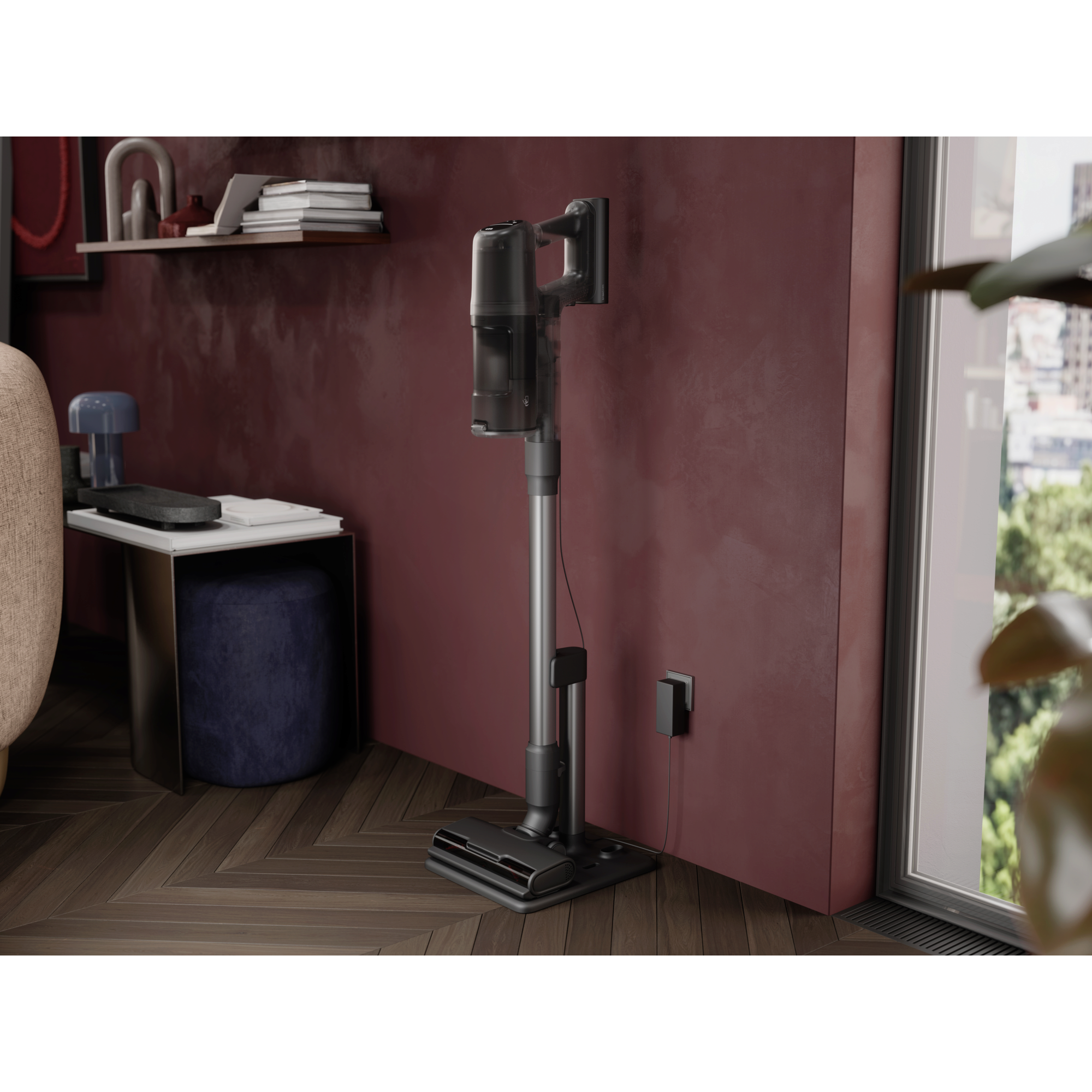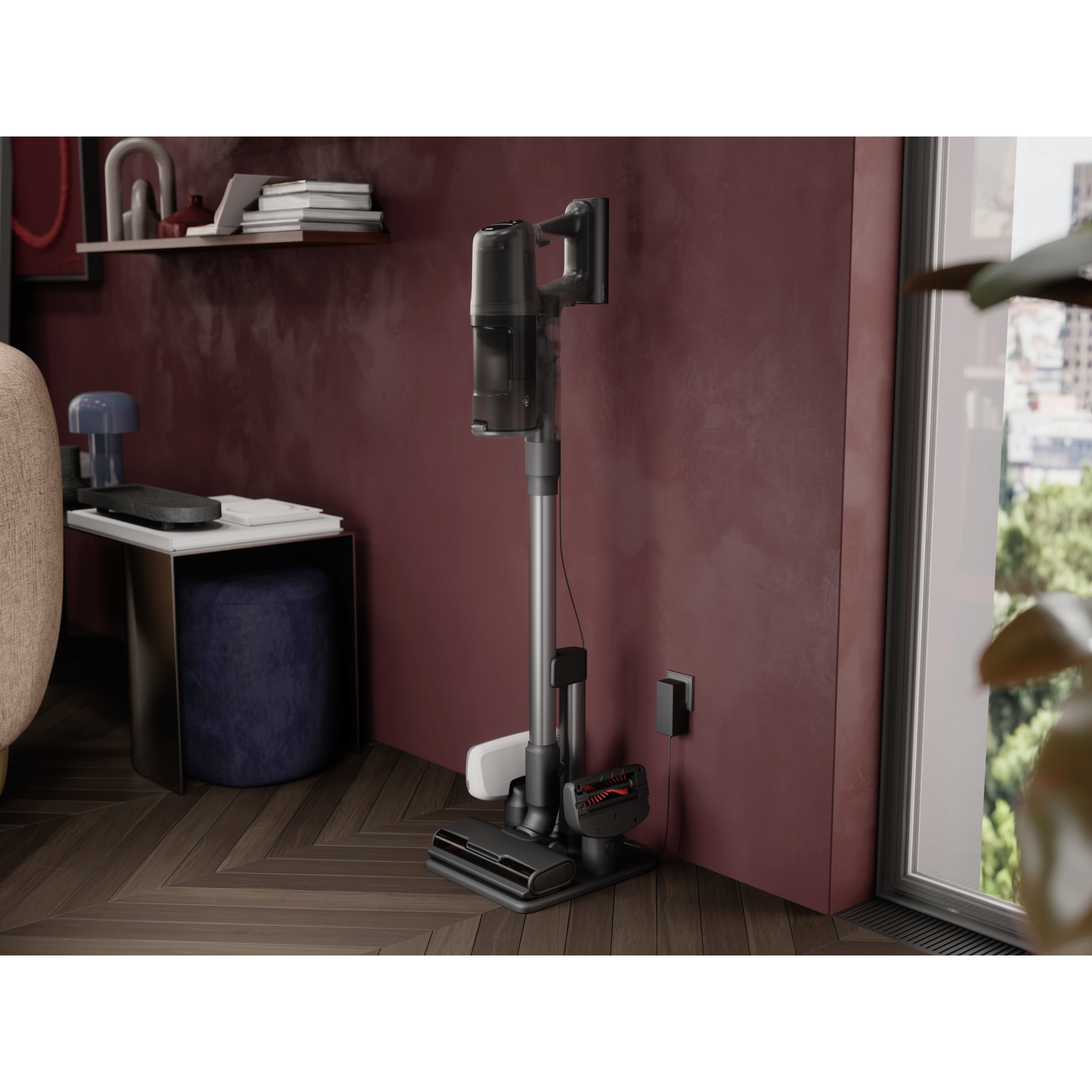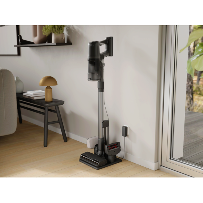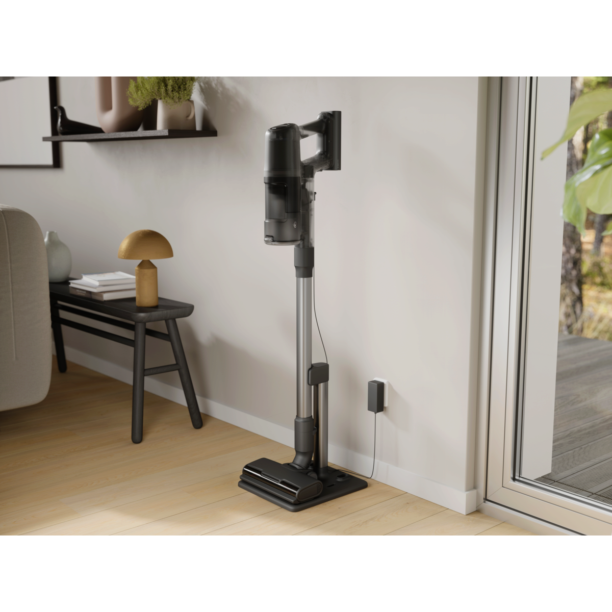 Plassbesparende oppbevaringsløsning. Med dette ladestativet har du alltid støvsugeren for hånden når du trenger det.