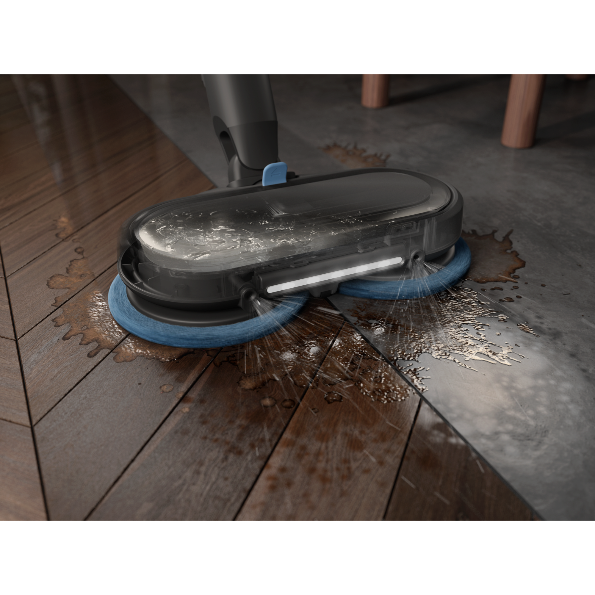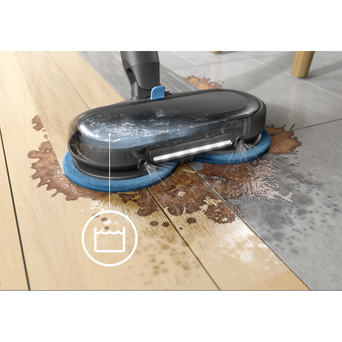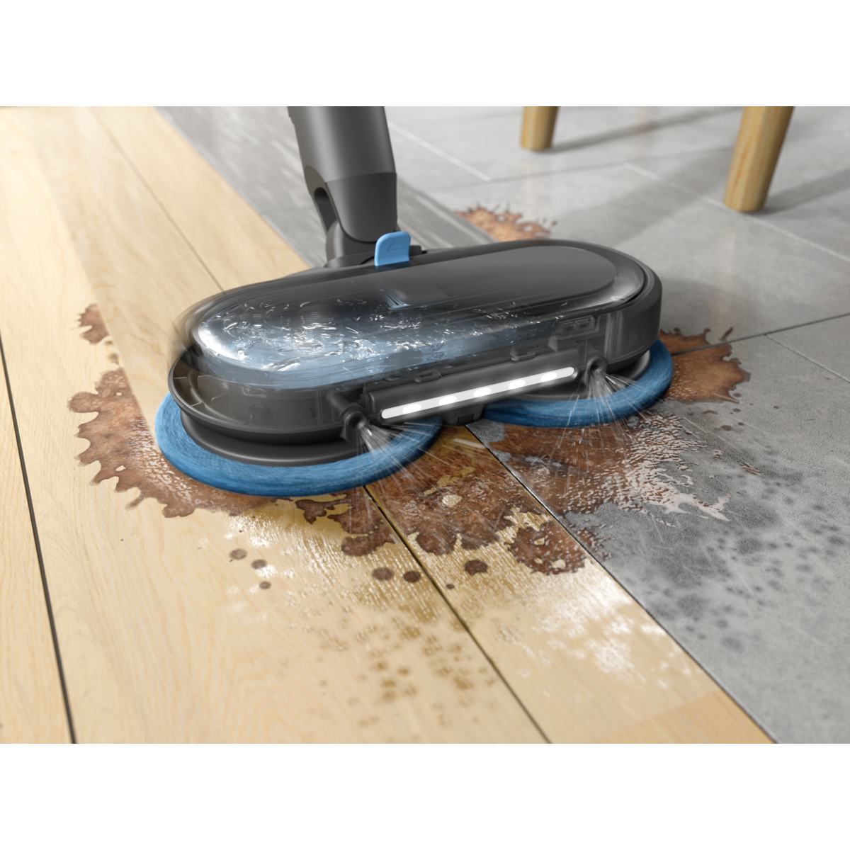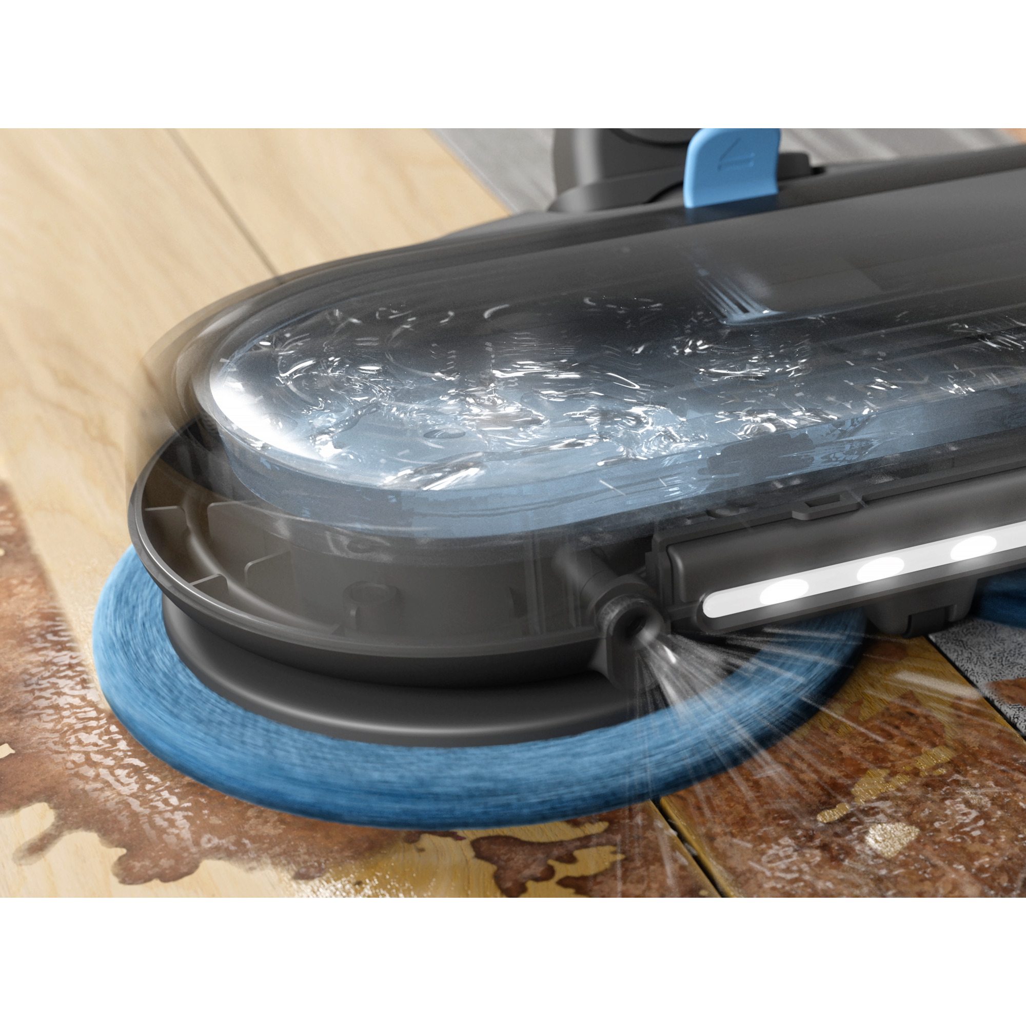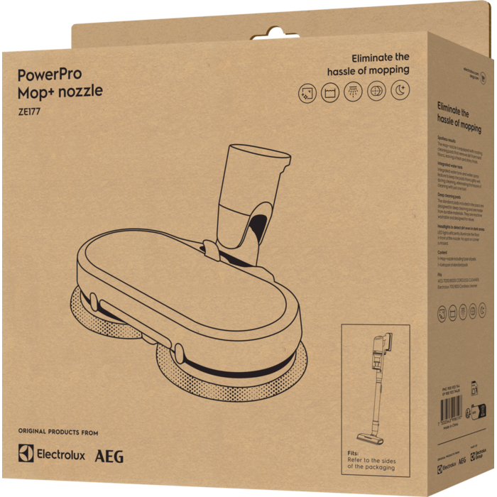Mop+-munnstykket er utstyrt med roterende rengjøringsputer som fjerner småsøl og besværlig skitt fra alle harde gulv, og etterlater seg en frisk og skinnende overflate.