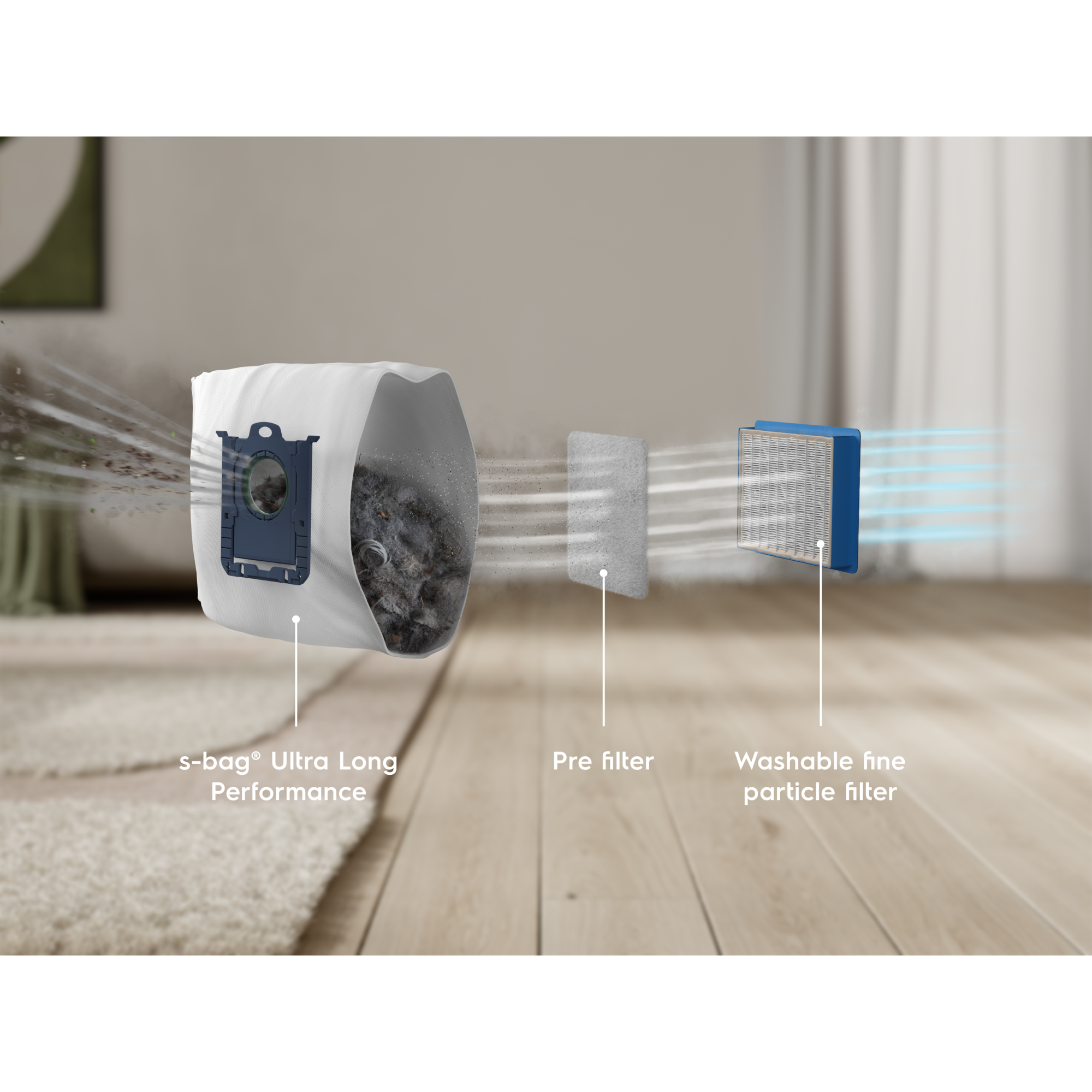*Basert på eksterne tester av filtrering av mikrostøvpartikkelstørrelser 0,3-10 mikron i henhold til standard IEC62885-2:2021, 5.14 ved bruk av standard sand/støvpartikler.