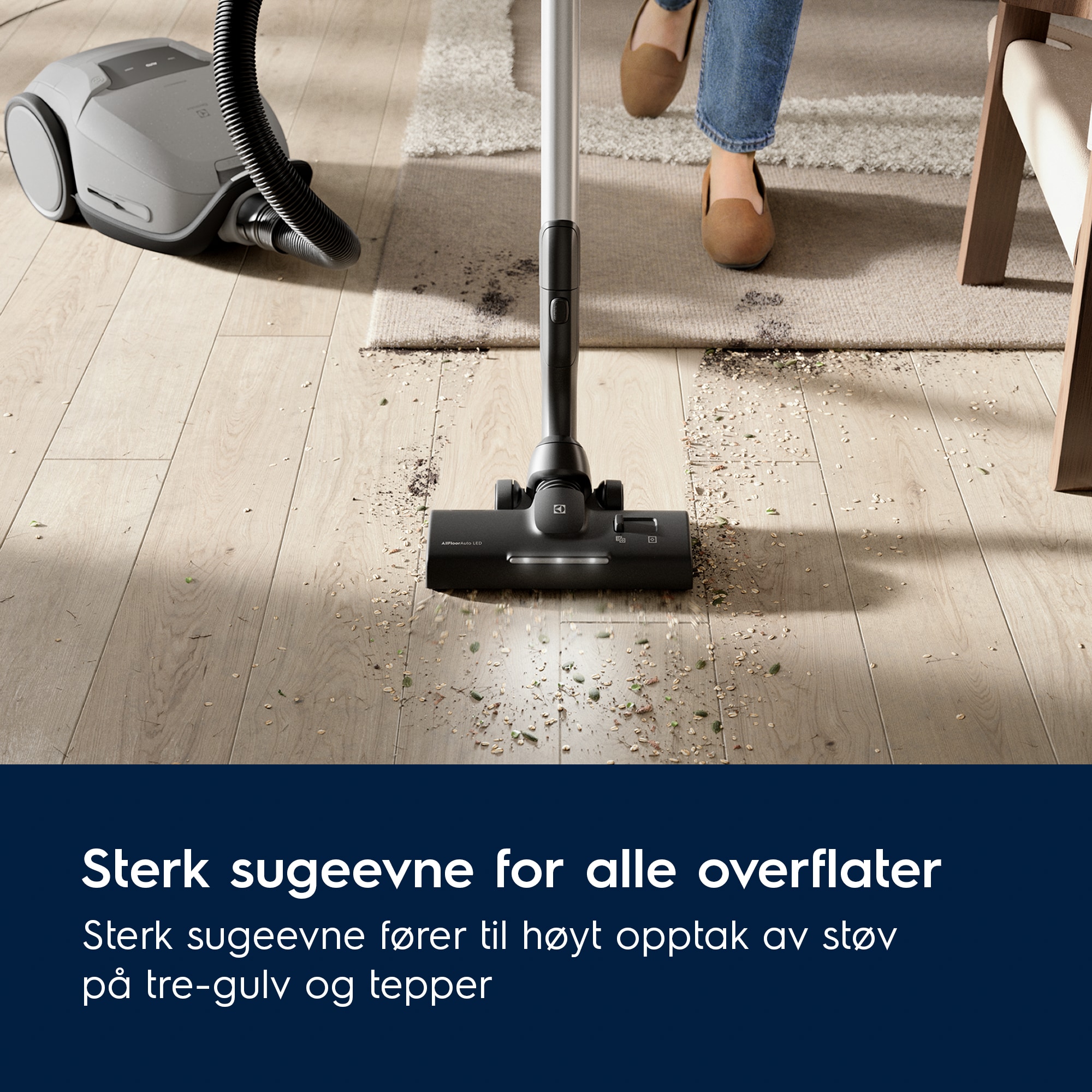 *Basert på interne tester i henhold til standard IEC 62885-2 som sammenligner strømforbruk ved Max-modus med Automodus ved rengjøring på teppe.