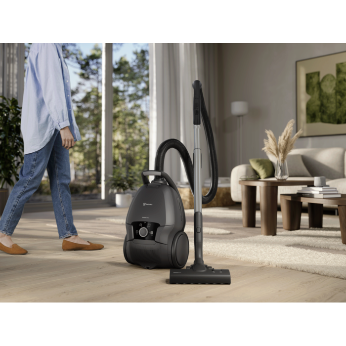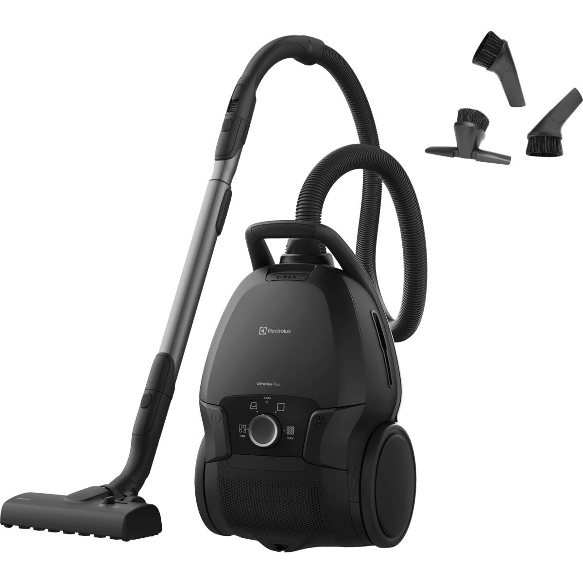 UltraOne Plus med AllFloor Auto-munnstykke – ingen behov for å justere innstillinger ved bytte av gulvtype. 5-liters s-bag Ultra Long Performance støvpose. Effektjustering med dreiehjul. AeroPro teleskoprør for maksimal luftstrøm. Standardhåndtak og integrert 3-i-1 verktøy. 12 meters rekkevidde og HEPA-filtrering med vaskbart s-filter. Farge: Ebony Black.